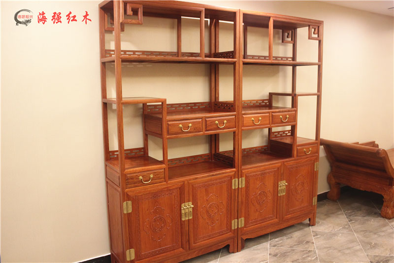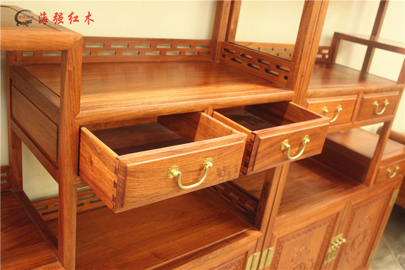此款博古架带有四个抽屉和两个柜。方便贮存物品。